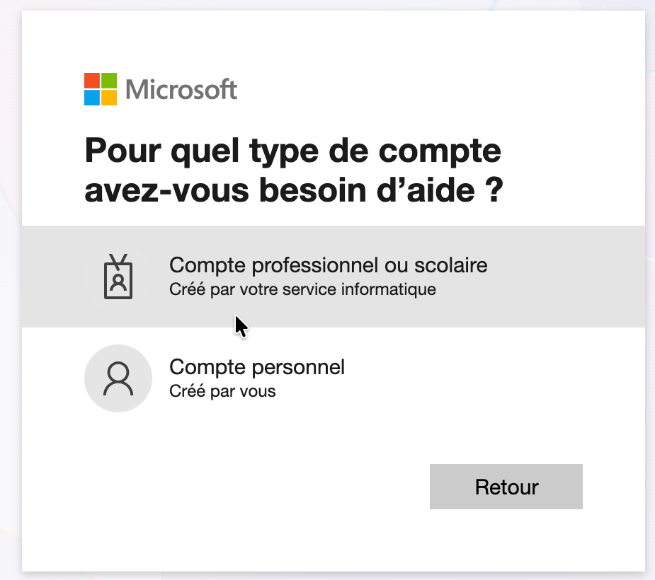 Cliquez sur compte professionnel ou scolaire