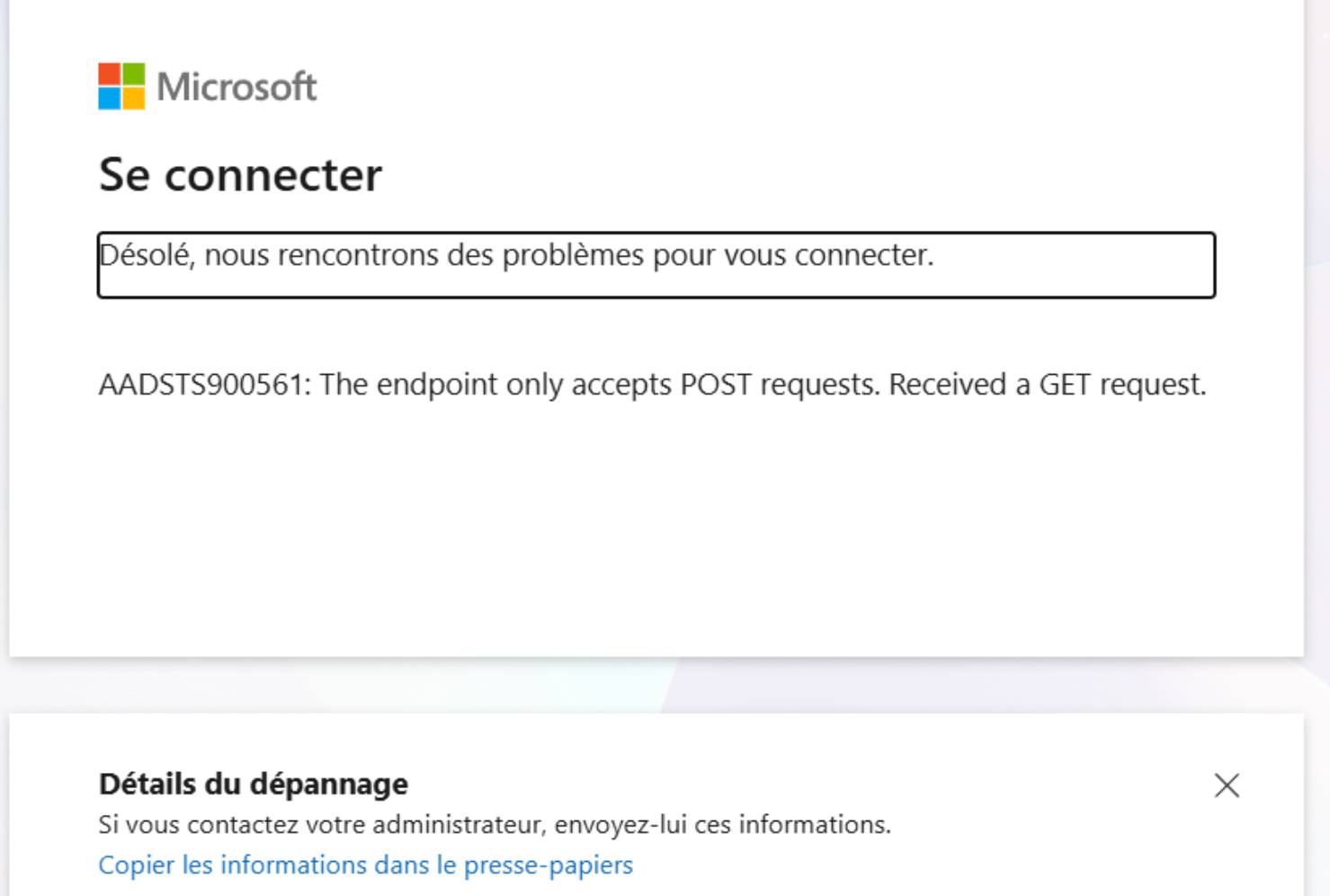 Si vous étiez édutiant ou intervenant l'année dernière attention de bien vérifier que vous vous connectez avec l'adresse de l'école (ne pas utilise ONMICROSOFT) sinon vous aurez systématiquement un message d'erreur du type :